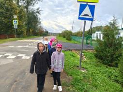 Обучающиеся из отряда ЮИД провели пешеходную экскурсию. Профилактическое мероприятие "Дом-школа-дом" проходило на пешеходном переходе вблизи школы.