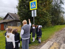Обучающиеся из отряда ЮИД провели пешеходную экскурсию. Профилактическое мероприятие "Дом-школа-дом" проходило на пешеходном переходе вблизи школы.